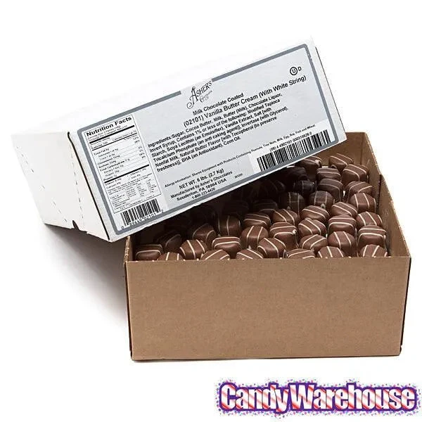 Box contains 6 pounds of Vanilla Butter Cream Milk Chocolate Candy.