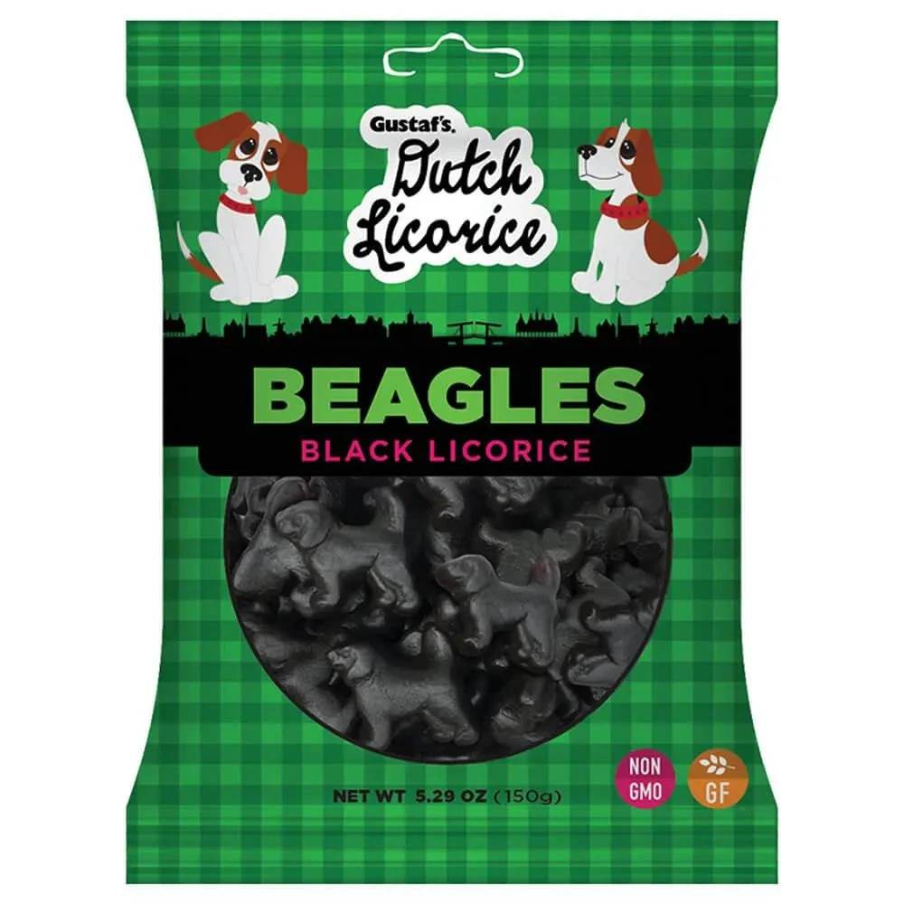 Box contains 12 5.29-ounce bags of Gustaf’s Dutch Licorice Beagles.