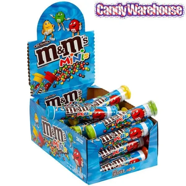Display box contains 24 M&M’s Minis Candy Mega Tubes, each with a net weight of 1.77 ounces.