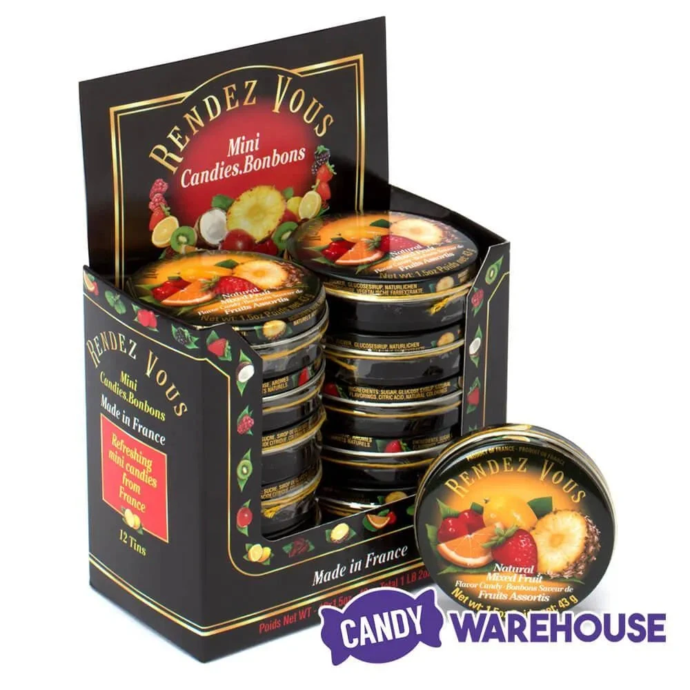 Display box contains 12 Rendez Vous Mixed Fruit Mini Bon Bons Candy Tins.